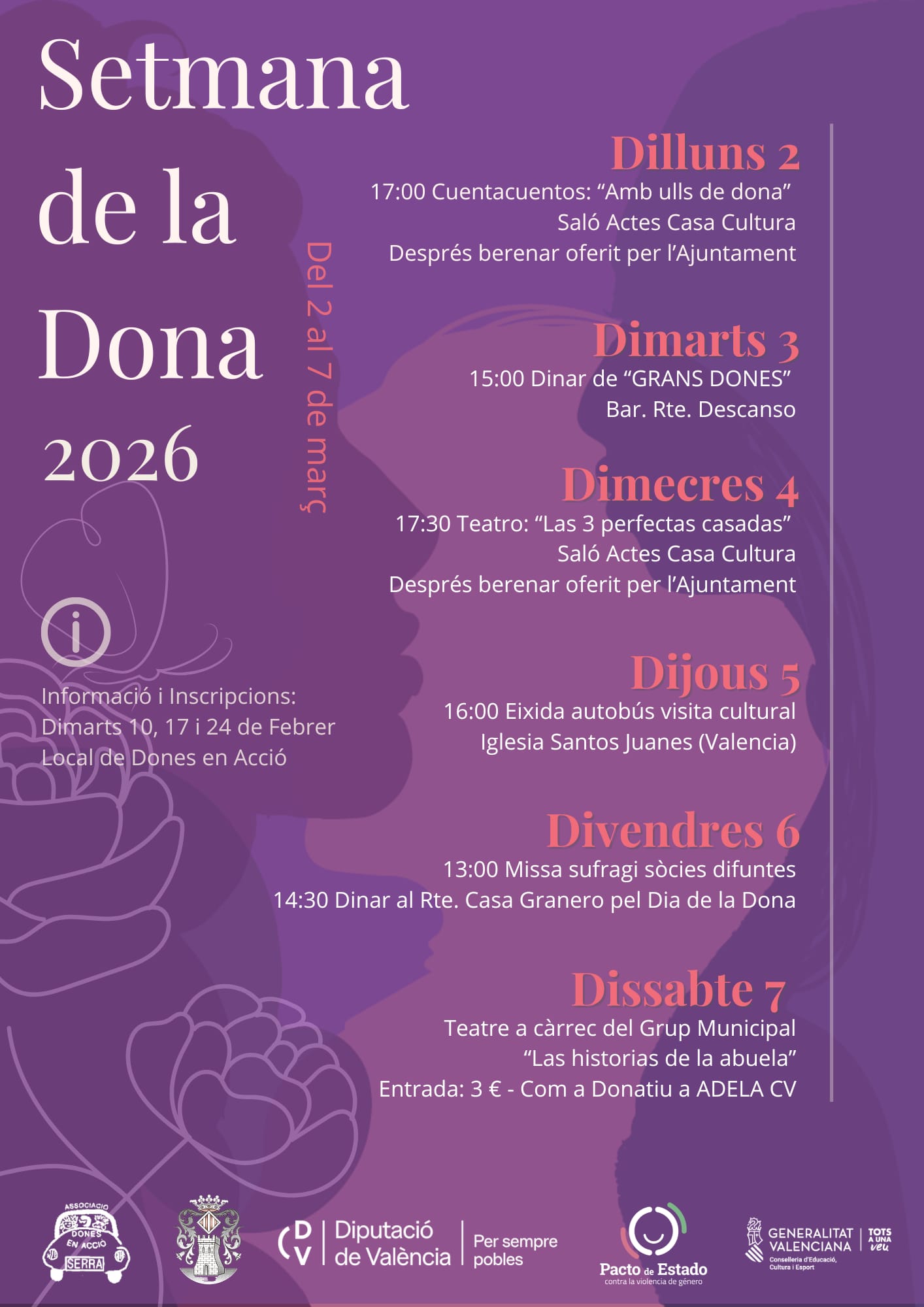 La Asociación de Dones en Acció, con la colaboración del Ayuntamiento de Serra, ha organizado una nueva edición de la Semana de la Mujer, que tendrá lugar del 2 al 7 de marzo de 2026 en Serra. Esta iniciativa anual tiene como objetivo reconocer el papel fundamental de las mujeres en la sociedad, promover la igualdad y fomentar la convivencia y la participación ciudadana.
