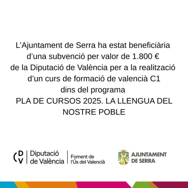 L’Ajuntament de Serra ha sigut beneficiari subvenció de 1800 € per la Diputació de València per a la realització d’un curs de valencià C1 dins el Pla de Cursos 2025. La llengua del nostre poble que cobreix íntegrament les despeses del curs.